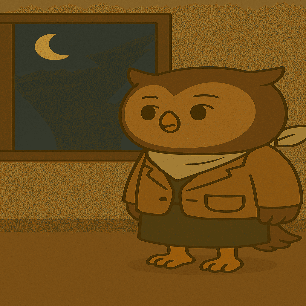 窓の外、誰かの影が通り過ぎる。フクロカは一瞬、目を細めるが、何事もなかったように微笑んだままだ。
