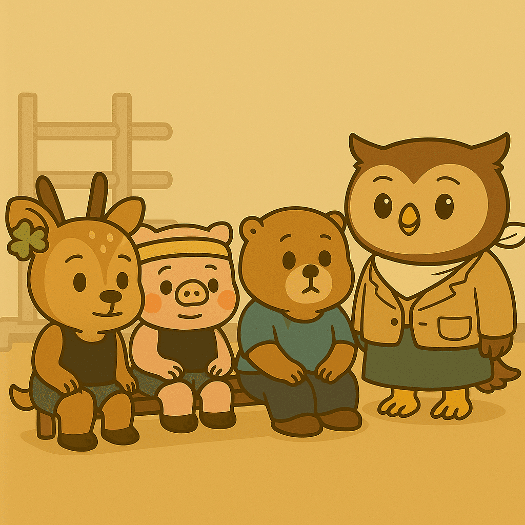 ──そのとき、ジムの隅のソファに座っていたフクロカが、ゆっくりと立ち上がった。
