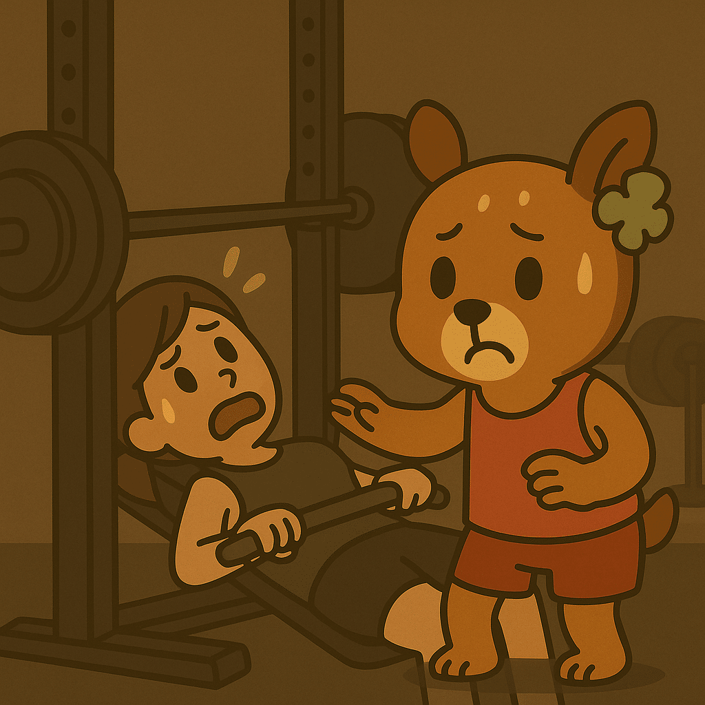 そのとき――隣のラックで女性会員がフォームを崩してバランスを失い、