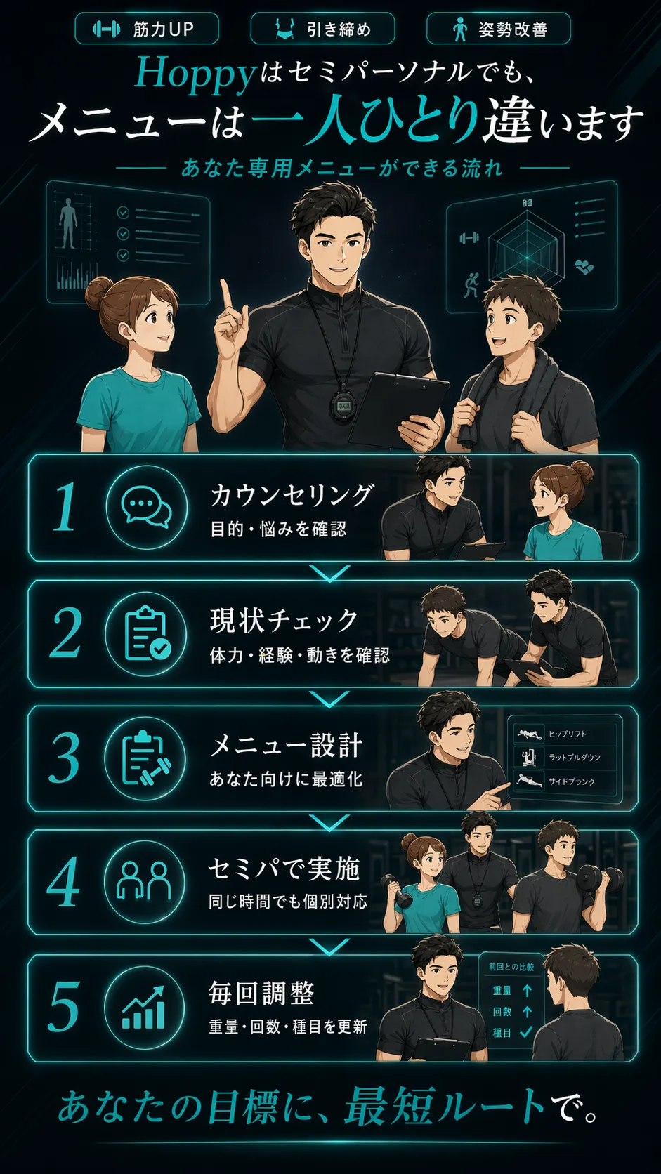 Hoppyでは、同じメニューをだいたい2か月を目安に続けていきます。